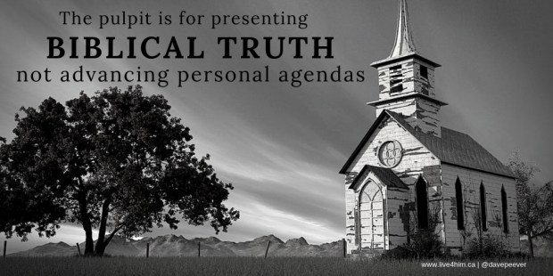 When the pulpit is used to advance personal agenda, promote, elevate or defend oneself; when the platform becomes a fundraising, guilt tripping place of manipulation; when the sermon becomes a political rally for the party of choice, biblical truth soon is replaced by human ambitions and desires.